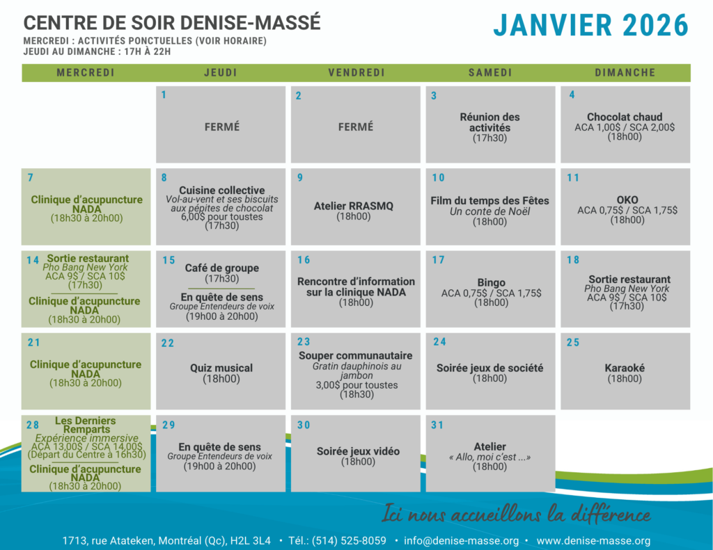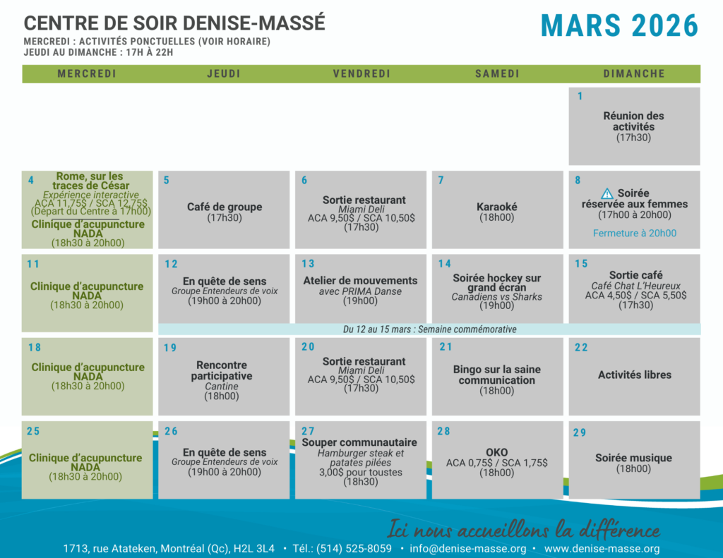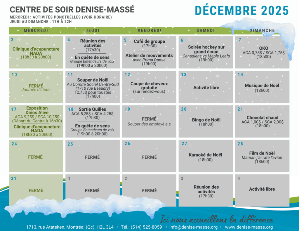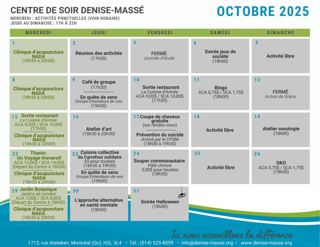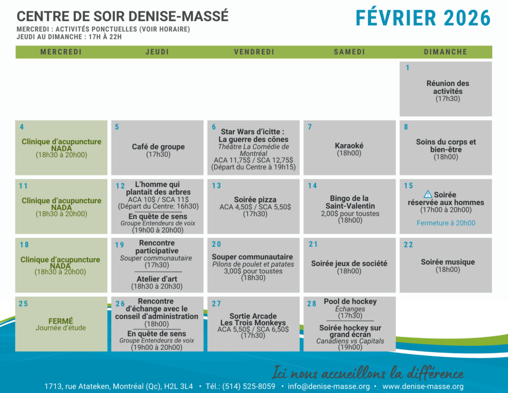 La participation aux activités est volontaire et n'est pas obligatoire. La planification de notre grille horaire respecte le principe de vie démocratique de notre organisme. Les activités qui la composent sont choisies, chaque mois, par les membres qui souhaitent participer.